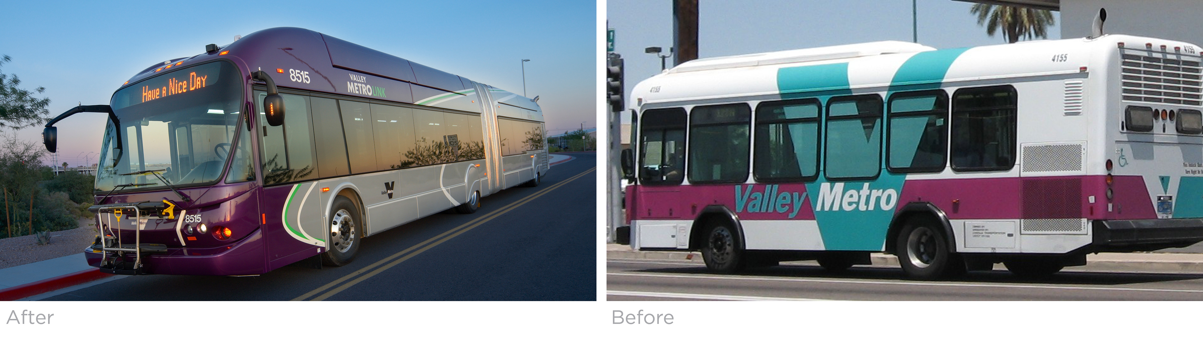 After a logo, identity, and nomenclature update, we then turned to what the public sees most, the fleet. Our research showed people gravitate toward fleet designs that feel fast and modern. But in the desert, “fast” isn’t enough. It has to feel cool. When temperatures hit 120+, perception matters as much as performance. So, we designed for both. A lighter, metallic system—clean, fast, and built to counter the idea of hot, muggy buses. Then we scaled it across everything: BRT, shuttle, carpool, vanpool, light rail. One system. Many vehicles. And one more thing—five different municipalities had to agree on it. They did.